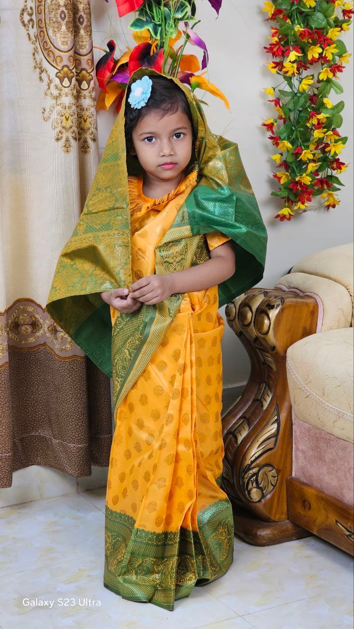 বাচ্চাদের কমলা সফট কাতান রেডি শাড়ি