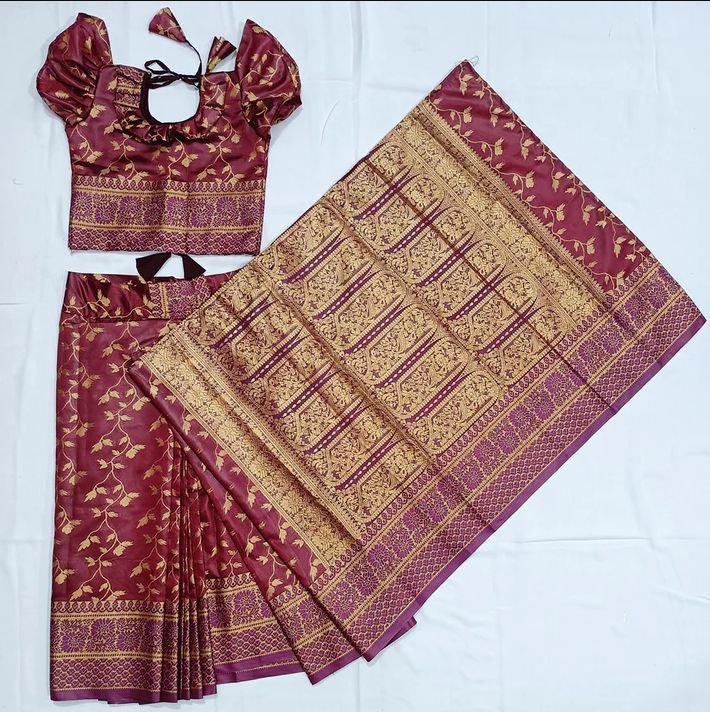 বাচ্চাদের খয়েরি জরি কাতান রেডি শাড়ি