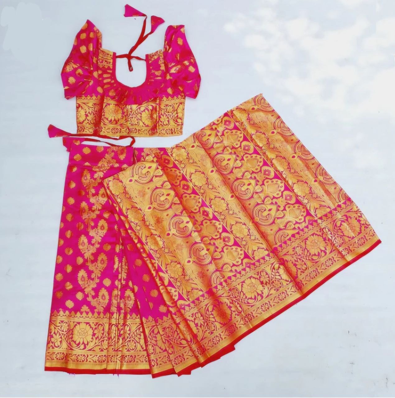 বাচ্চাদের গোলাপি  সফট কাতান রেডি শাড়ি