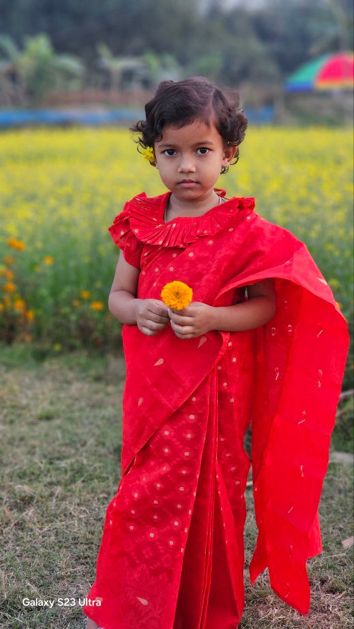 শাড়ির কুচি সেলাই করে ফিক্সড করা থাকে এবং কোমরে ফিতা দেওয়া আছে, ফলে খুলে যাওয়ার কোনো ভয় নেই। শাড়ির ইনার অংশে উন্নত মানের ভয়েল ফেব্রিক ব্যবহার করা হয়েছে, যা বাচ্চাদের জন্য খুবই আরামদায়ক ও হালকা।