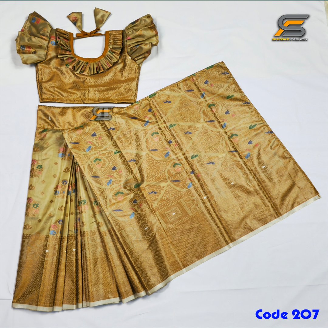 বাচ্চাদের গোল্ডেন সফট কাতান রেডি শাড়ি।
